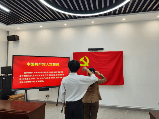 宣誓仪式在雄壮激昂的《国际歌》旋律中拉开帷幕。党支部书记陈青云同志首先向新加入党组织的同志致以热烈欢迎,随后带领新发展党员面向党旗,举起右拳庄严宣誓。铿锵有力的誓言回荡现场,彰显着新党员对党忠诚、为党的事业奋斗终身的坚定决心。